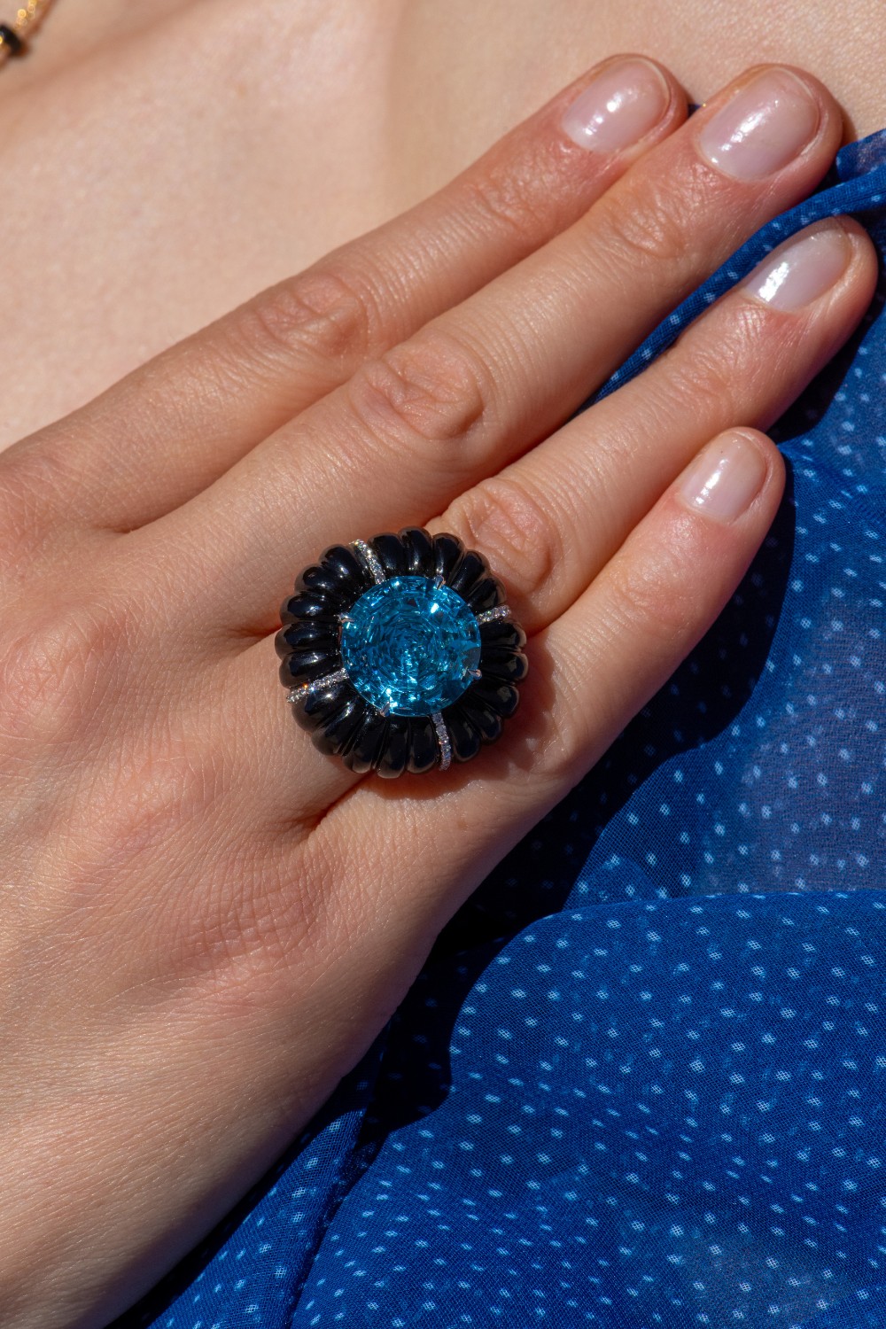 This elegant ring features a luminous blue topaz n estled in white gold, framed by soft, petal likecurves set on detailed with glossy black onyx. Thecontrast adds boldness to its gentle form, while thegemstone radiates clarity and calm. A refined piecedesigned to quietly command attention with everyglance.