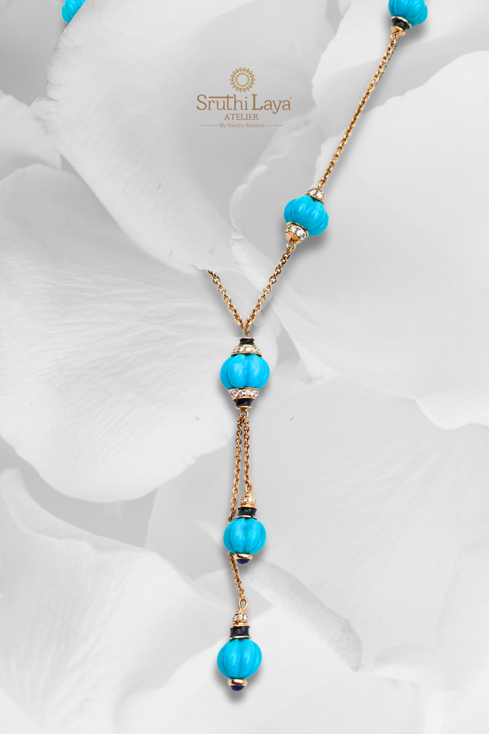 The Sruthilaya woman is confident, elegant, and ever so versatile — just like the "Azure Allure" longchain. A fine, handcrafted luxury piece that transcends occasions, this necklace is a true expression of timeless beauty and effortless style.