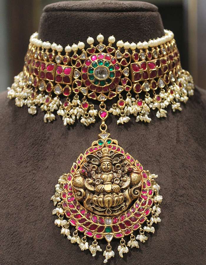 A perfect blend of traditional design in modern choker with jadau and pearls