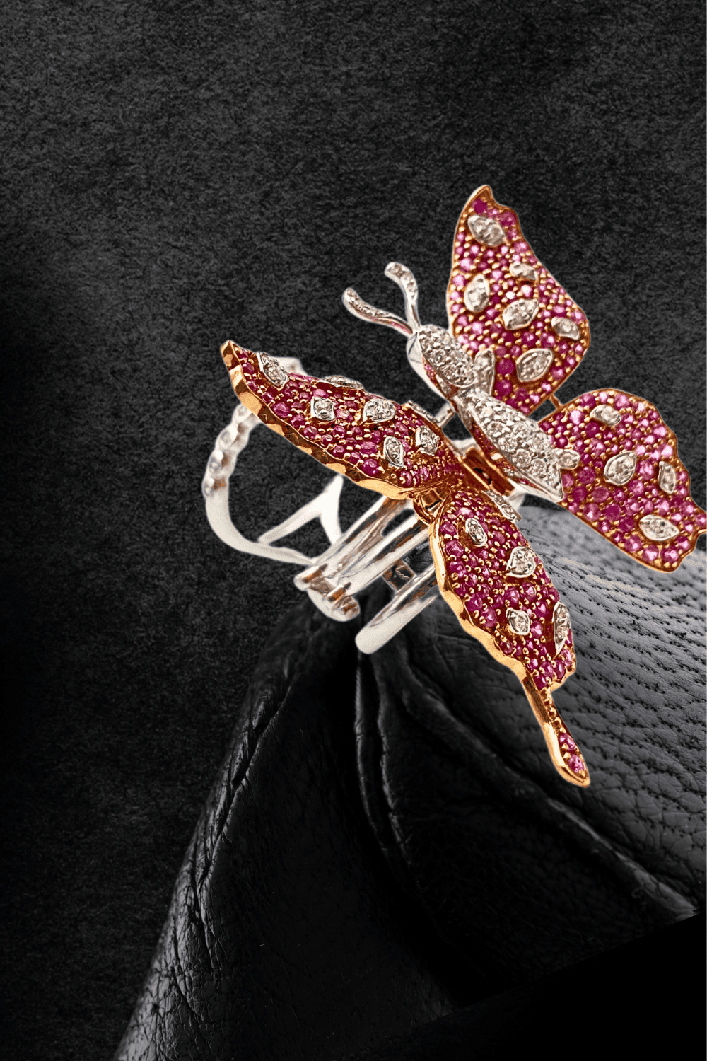 Introducing the Butterfly Ring, an extravagant statement piece crafted in 18 karat gold. Adorned with stunning Burmese rubies and sparkling diamonds, this larger-than-life design captures the essence of blooming beauty. Perfect for cocktail parties, it’s a true showstopper that will steal the spotlight and elevate any ensemble. Embrace the allure of this captivating ring, where elegance meets artistry in a dazzling display!