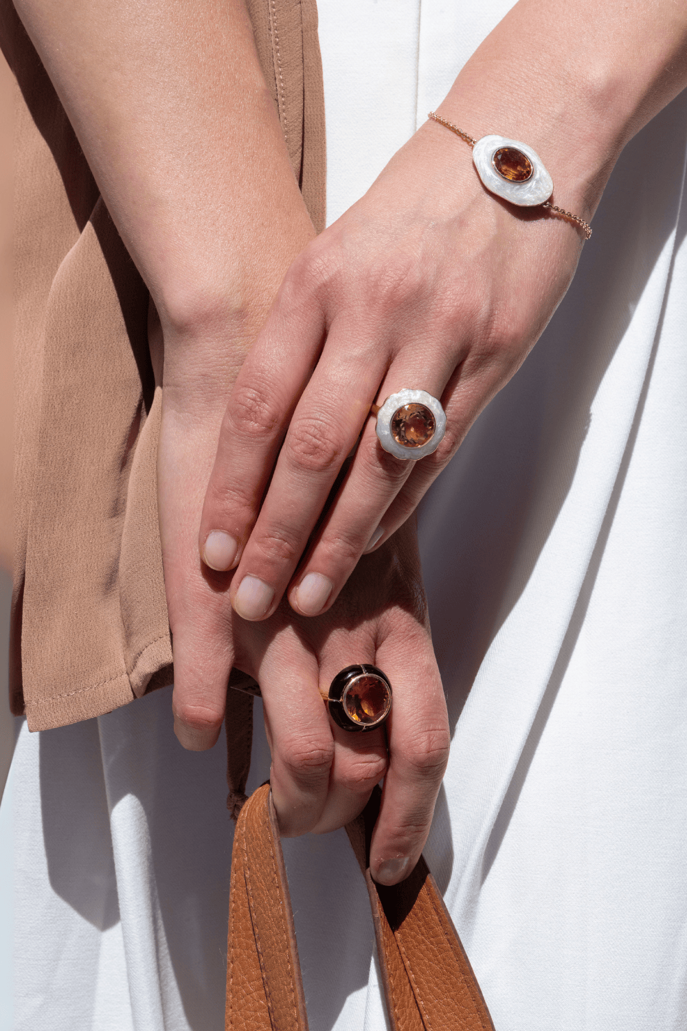 A fiery citrine glows at the centre of this sculptural ring, cradled in sleek black onyx and set in polished yellow gold. Bold yet graceful, the five-petal bloom silhouette evokes warmth and strength perfect for the woman who leads with heart and leaves a luminous impression.