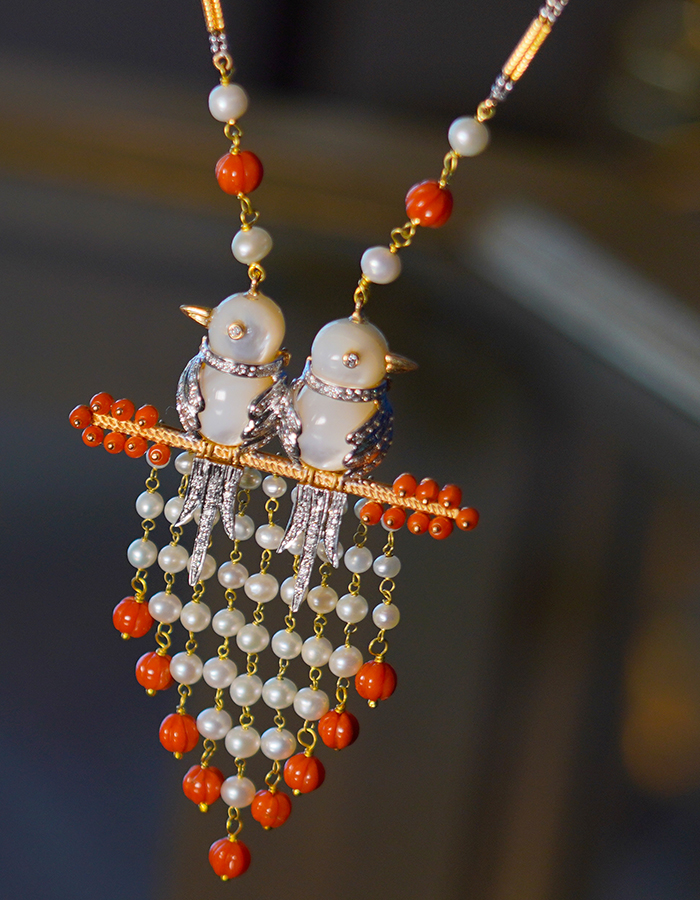 The carved corals, studded with diamonds and combined with the onyx, add to the elegance of the piece.