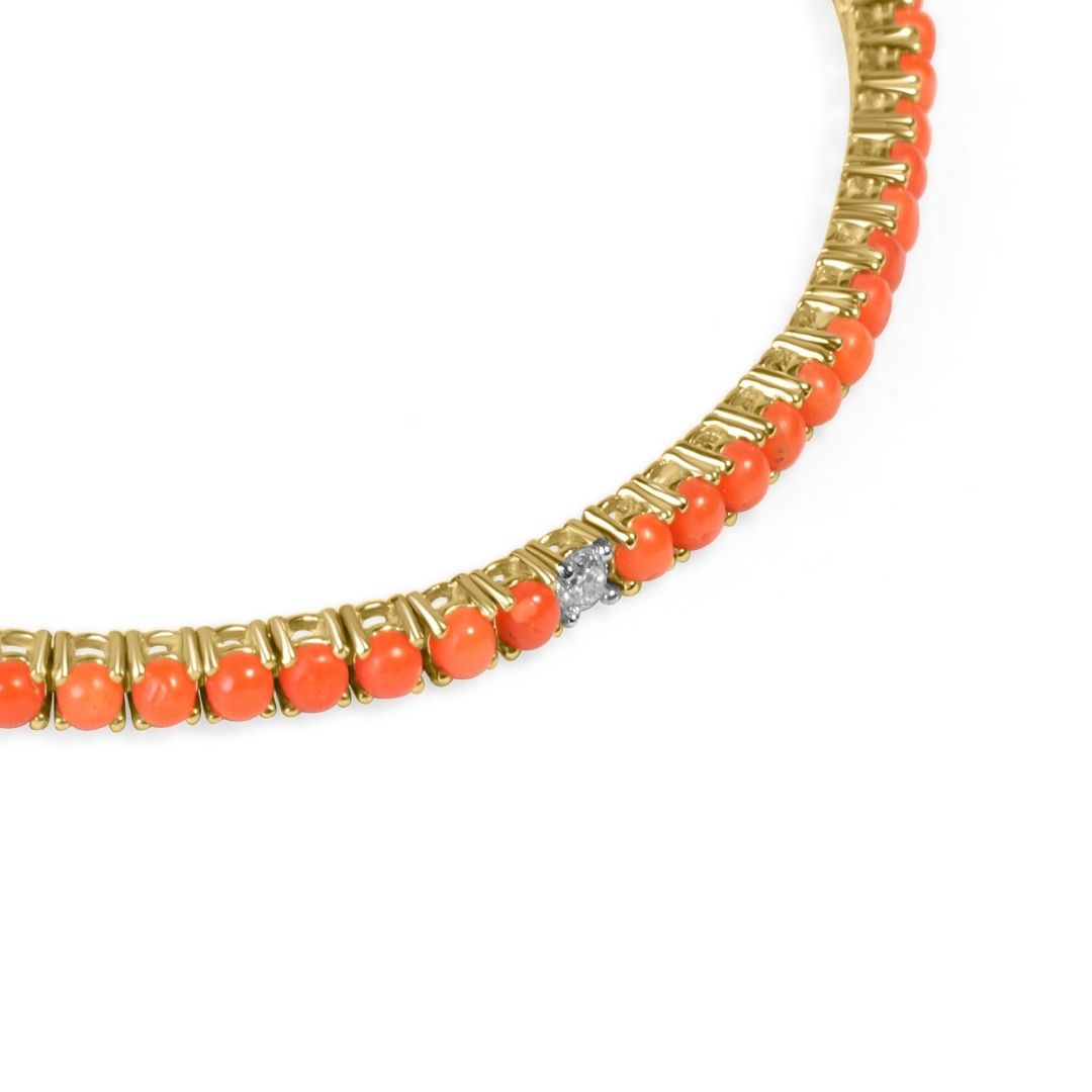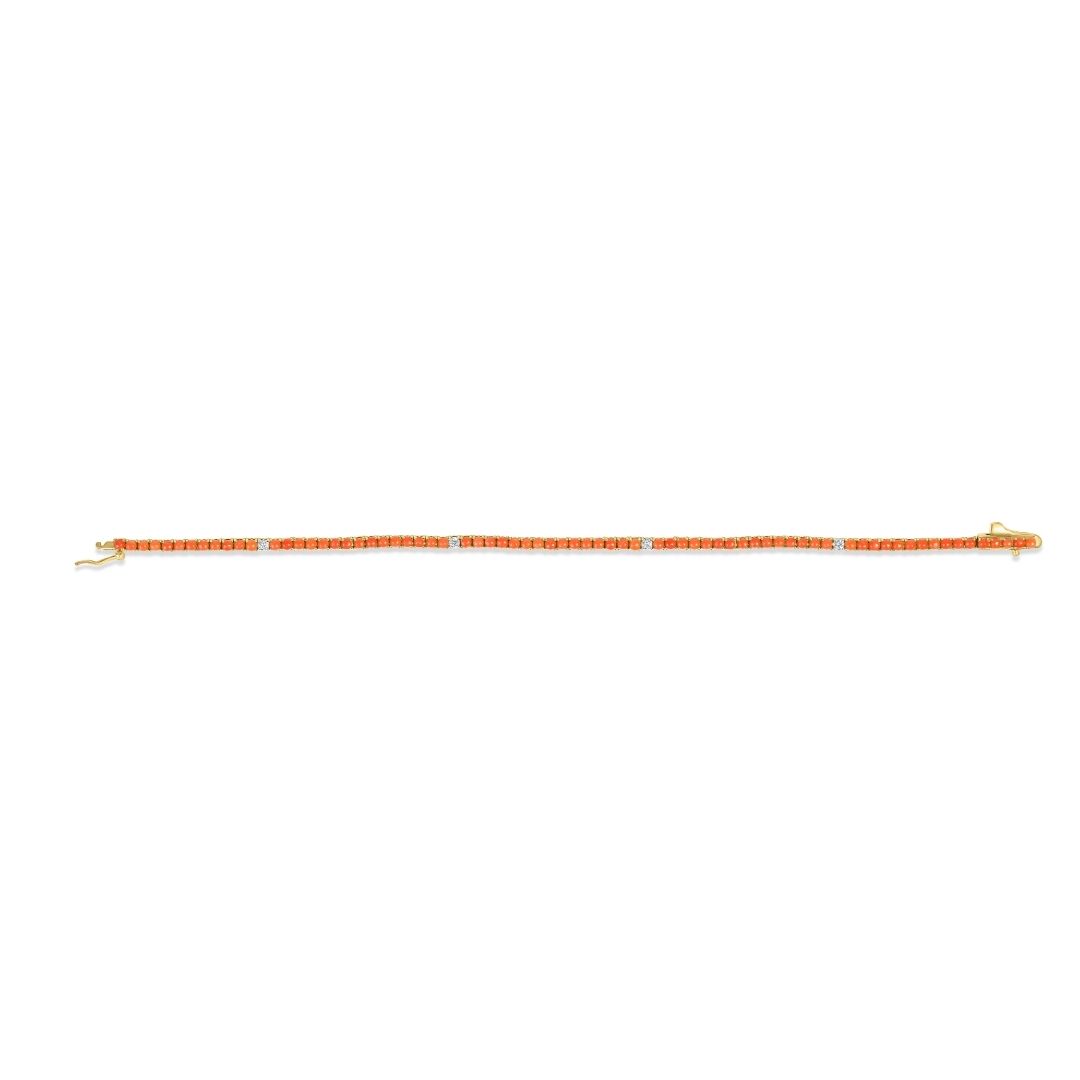 This delicate coral-hued tennis bracelet showcases a radiant row of square-cut stones, each precisely set to create a smooth, continuous line of color. Framed in a sleek rose gold band, the warm tones blend effortlessly, offering a perfect balance of elegance and vibrancy. Lightweight yet luxurious, it adds a refined touch to any look, making it an ideal piece for both everyday wear and special occasions.