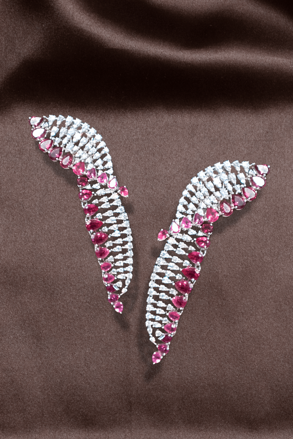 Discover the exquisite beauty of Sruthilaya’s Ruby and Diamond Curved Hanging Earrings, featuring a stunning arrangement of radiant rubies and brilliant diamonds. The curved design allows these earrings to hang gracefully, enhancing your natural elegance with a lovely, fluid motion. Crafted in premium 18-karat gold, they perfectly complement red undertones, adding a touch of luxury and sophistication. Designed to capture light from every angle, these earrings make an exceptional choice for any special occasion. Embrace the exquisite charm of these treasures and shine with timeless grace!