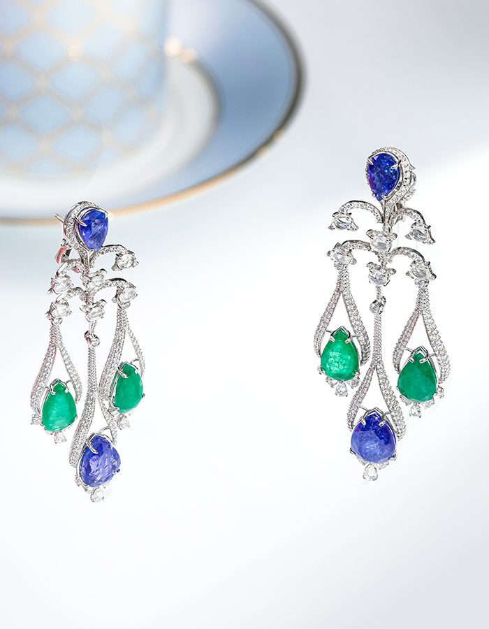 Discover the exquisite beauty of Sruthilaya’s Emerald and Tanzanite Drop Earrings, inspired by the graceful forms of aqu...