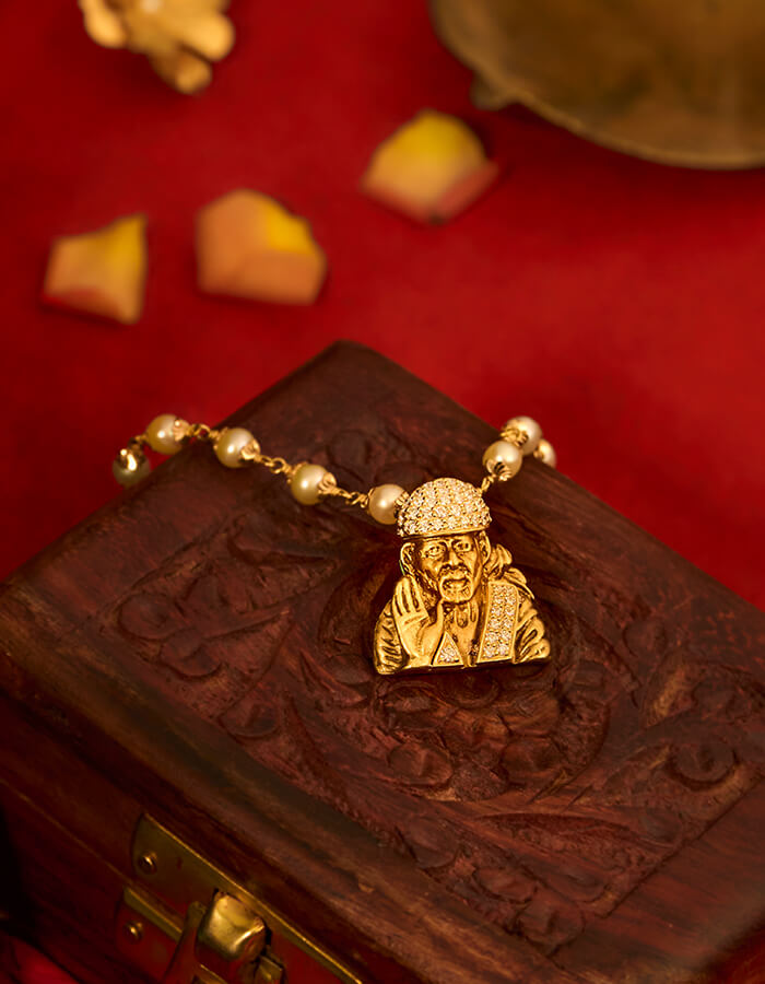 In frame, the most human divinity Sai Baba. The Sai Baba pendant in 22kt gold studded with diamonds, perfectly paired with gold and pearl chain.
