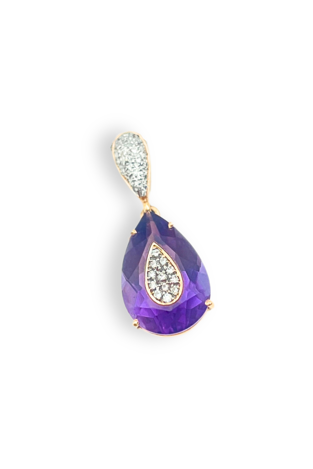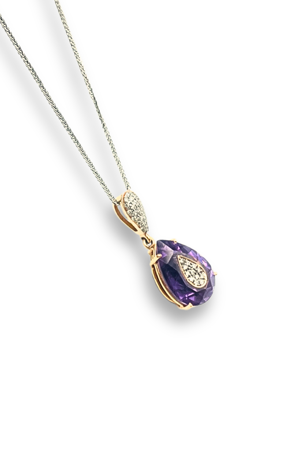 This elegant pendant showcases a captivating pear-shaped amethyst, renowned for its rich, deep purple hue. The amethyst is meticulously set in a delicate gold-toned frame, adding a touch of sophistication. To enhance its allure, the pendant is adorned with shimmering diamonds that gracefully accentuate the natural beauty of the amethyst. The diamonds are carefully arranged in a complementary pattern, creating a harmonious and eye-catching design. The pendant is suspended from a fine silver chain, ensuring a comfortable and stylish fit. This exquisite piece is perfect for special occasions or as a daily statement piece, adding a touch of luxury to any ensemble.