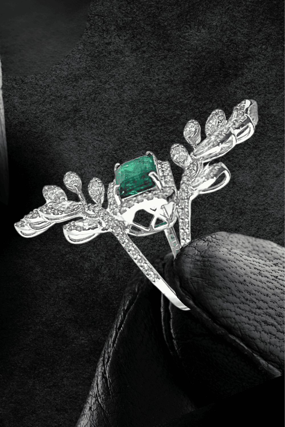 Discover the breathtaking beauty of Sruthilaya’s natural emerald extravagant ring, where maximalism meets iconic design. Featuring intricate branches topped and bottomed with dazzling diamond leaves, this larger-than-life piece showcases a stunning central emerald, all set in 18-karat white gold. A true celebration of craftsmanship and pure gemstones, perfect for making a bold statement.
