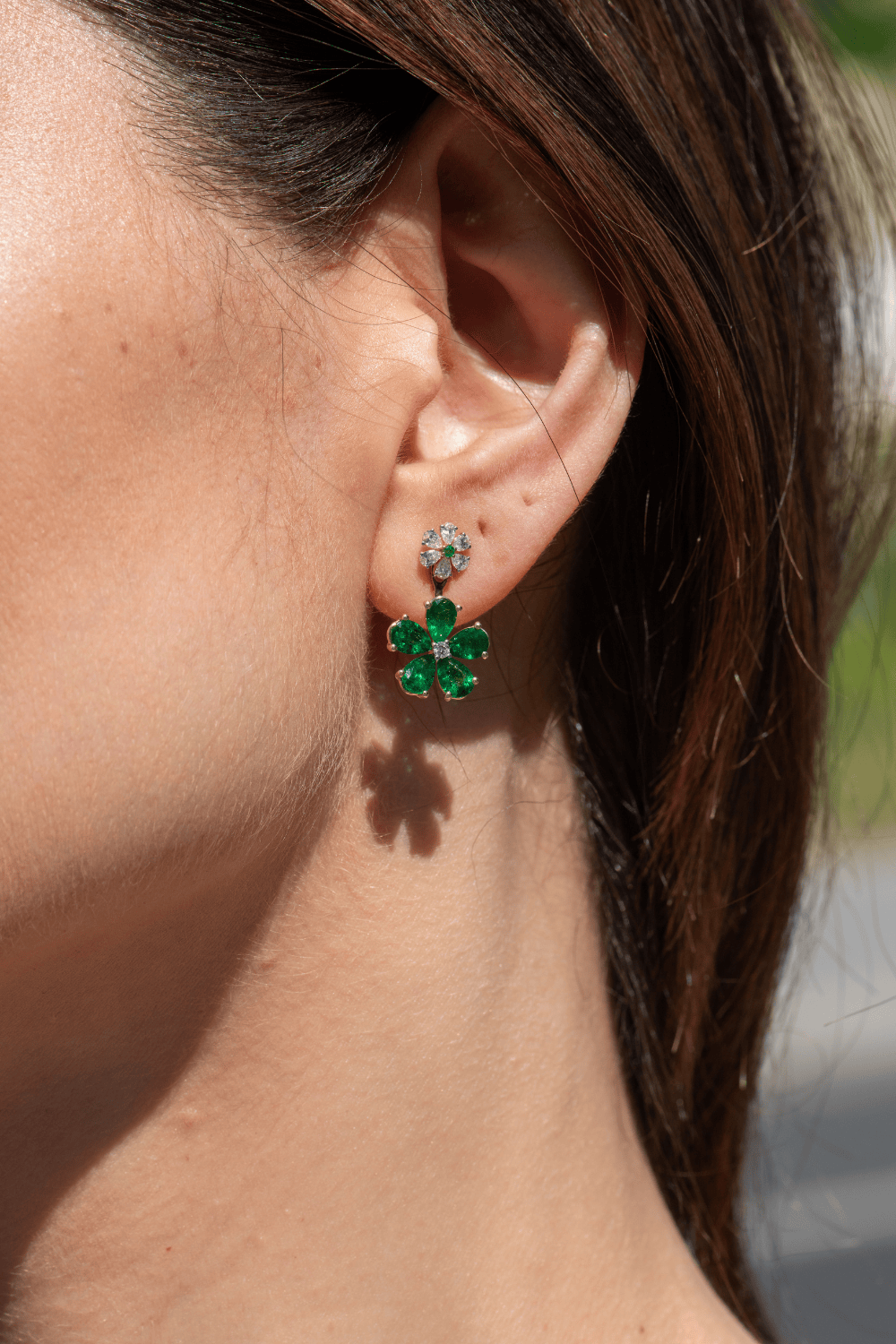 Cherishing the story of balance, these dual floral earrings pair clarity and heart. The top bloom sparkles with white stones, bright and crystalline, while the bottom opens in rich green petals, full of earthy calm. Together, they echo harmony between thought and feeling bold, grounded, and beautifully attuned to your rhythm.