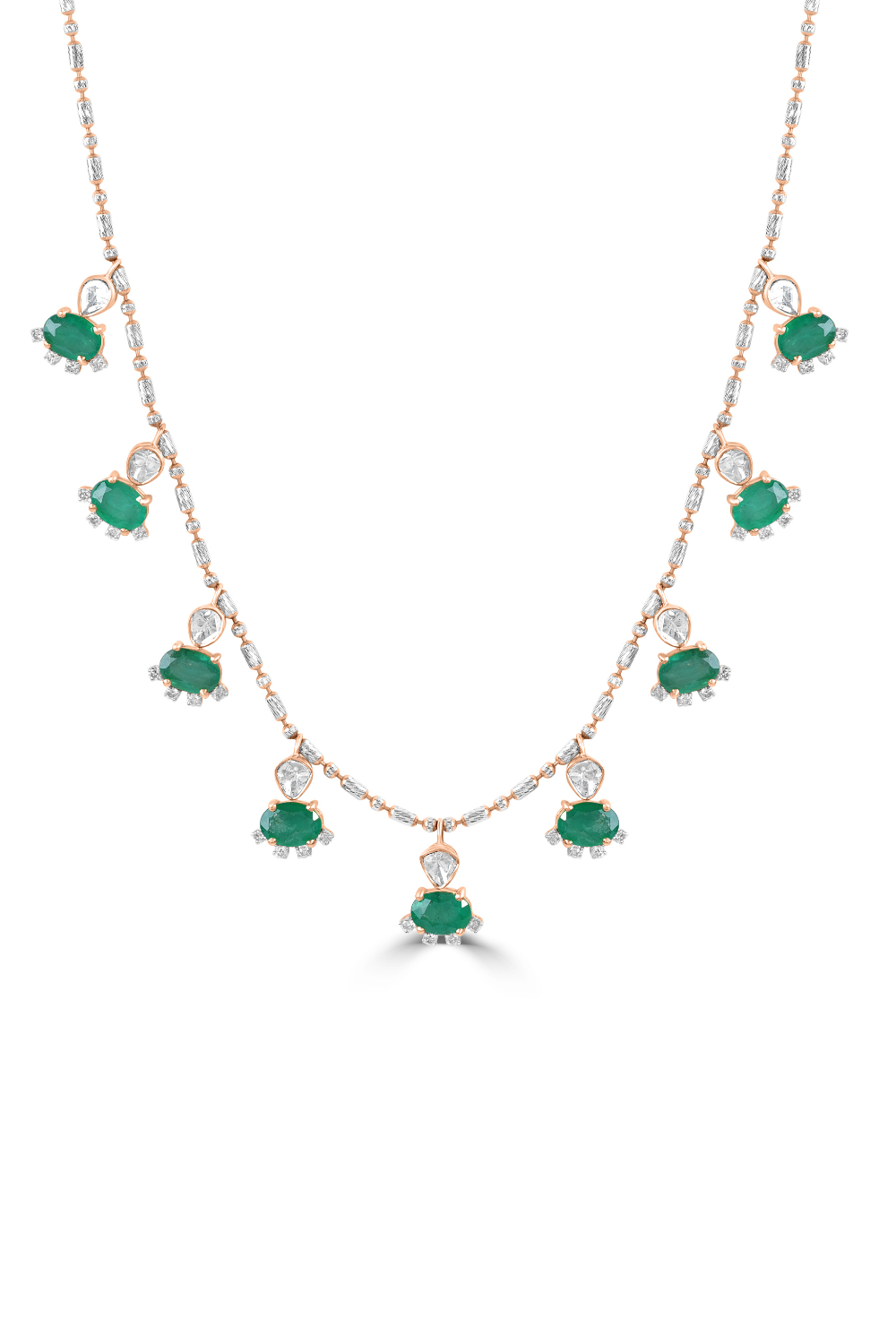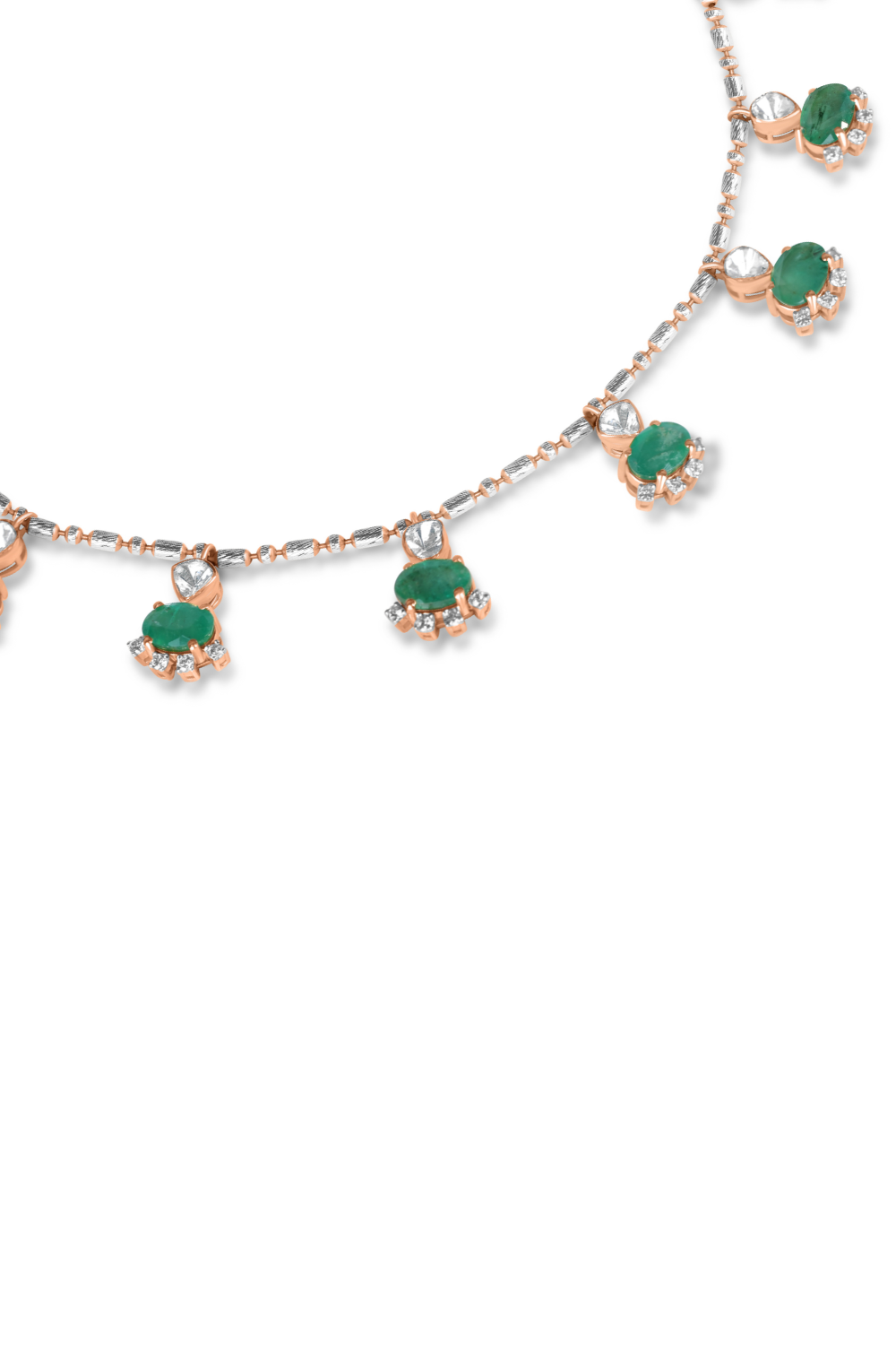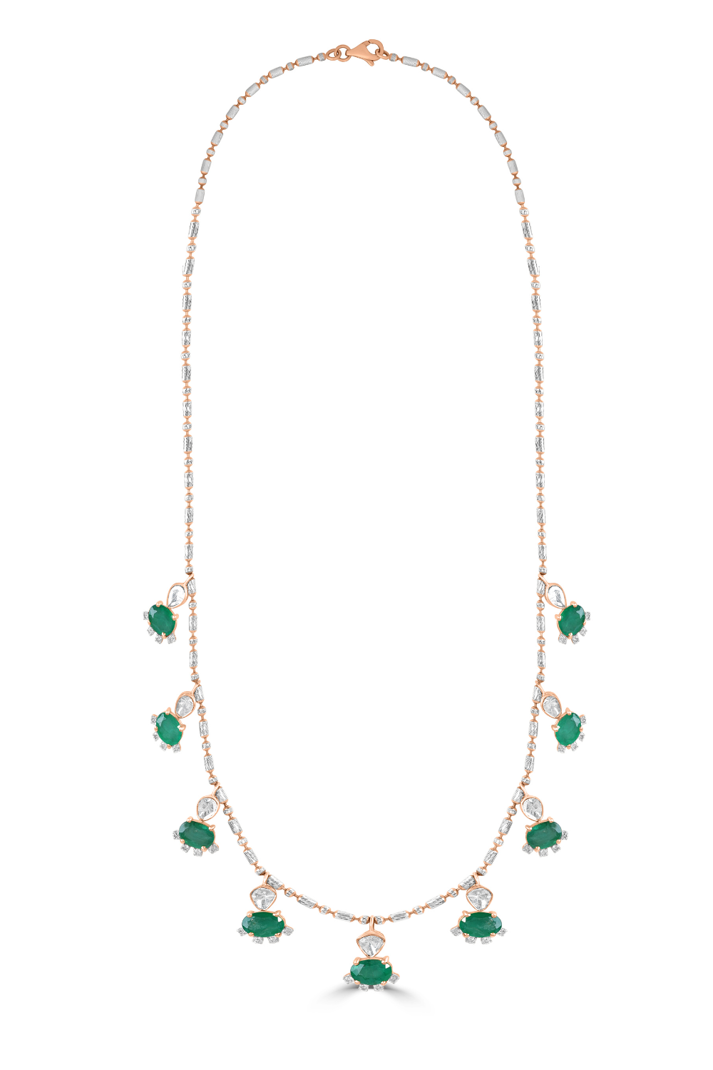 Each emerald is carefully selected for its vivid color and natural allure, bringing a sense of freshness and timeless charm to the design. The gemstones catch the light subtly, creating a refined sparkle that enhances the necklace without overpowering its graceful simplicity.