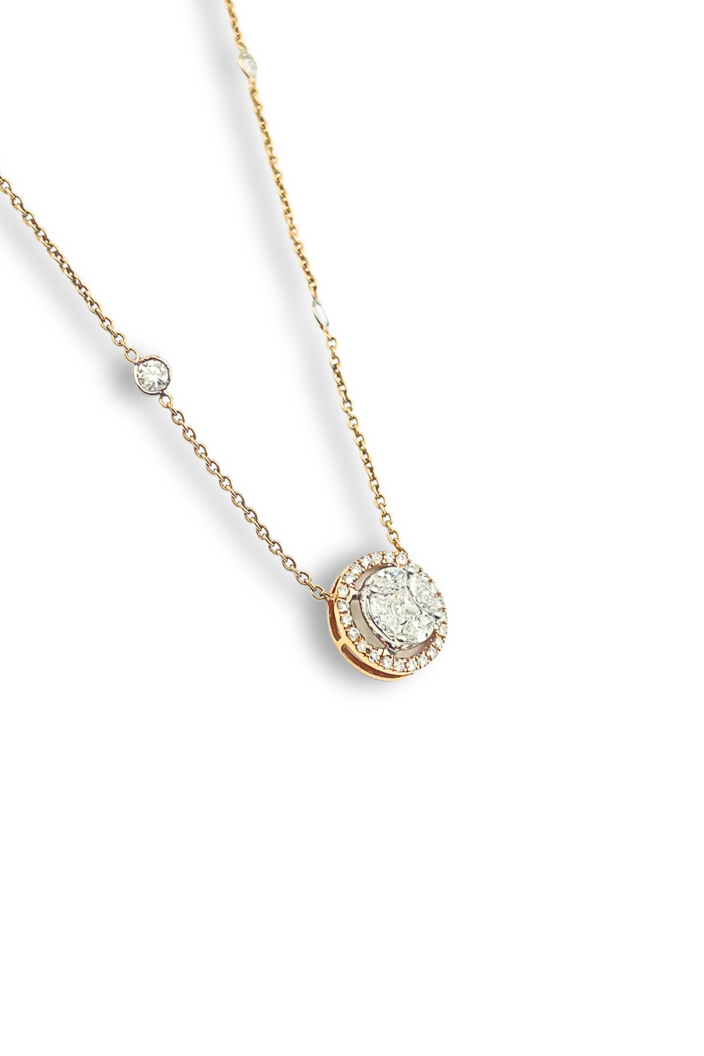 This elegant necklace showcases a captivating diamond halo that surrounds a central diamond, creating a radiant and eye-catching design. The diamonds are meticulously set in a delicate rose gold setting, adding a touch of warmth and sophistication. The pendant is suspended from a fine chain, ensuring a comfortable and stylish fit. This exquisite piece is perfect for special occasions or as a daily statement piece, adding a touch of luxury to any ensemble.