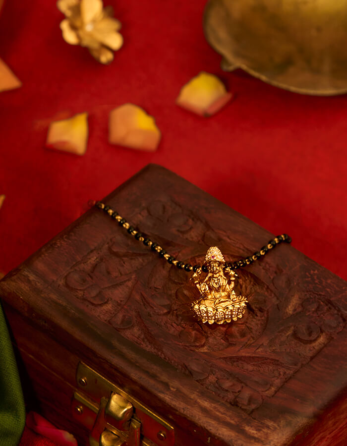Embrace divinity and elegance with this exquisite creation — the Goddess Laxmi pendant, a symbol of wealth, fortune, power, and beauty. Crafted in pure 22kt gold and meticulously studded with sparkling diamonds, this pendant embodies both spiritual grace and timeless luxury. The intricate design pays homage to Goddess Laxmi, bringing positivity, prosperity, and blessings to its wearer. Paired with a traditional black bead gold chain, it strikes a perfect balance between cultural heritage and modern sophistication