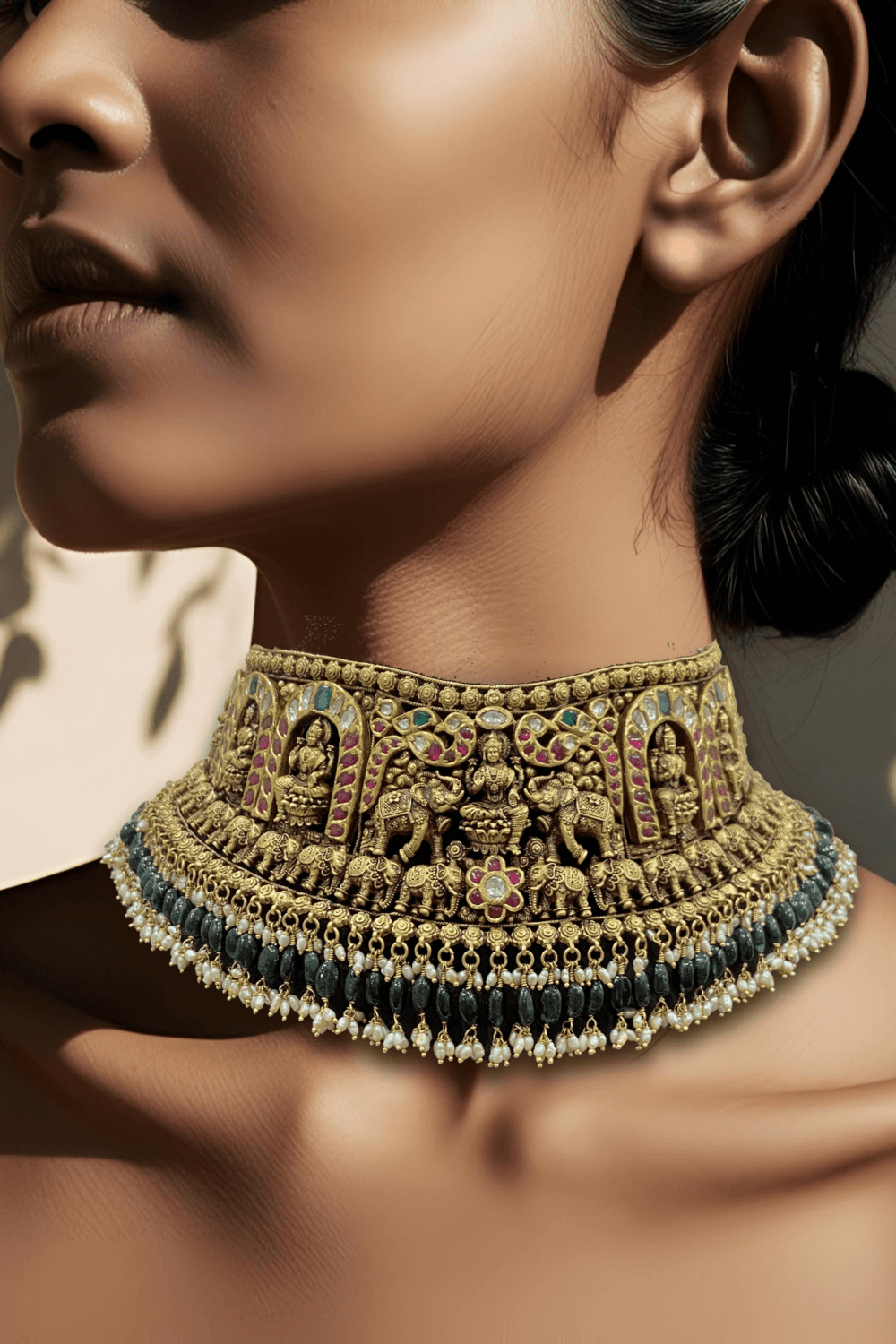 This stunning necklace, set in 22Karat gold, features the divine Goddess Lakshmi Ji and majestic elephant motifs. The intricate Nakshi work highlights the exceptional craftsmanship of our artisans. The goddess's beauty reflects the dedication and skill poured into creating this masterpiece. It’s a true pleasure witnessing the artisans bring this magnificent neckpiece to life. Detailed Craftsmanship: Polki, Ruby, Emerald and Pearl.
