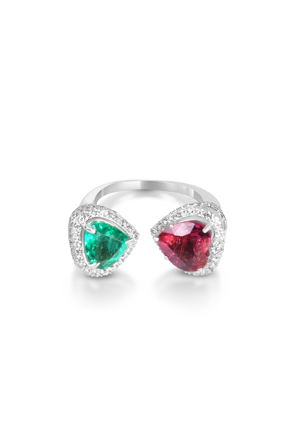 A symbol of love and balance, this elegant cuff ring unites a radiant emerald and a passionate ruby oneither end of a sleek gold band. The Zambianemerald signifies peace and renewal, while the rubyembodies strength and desire. Together, they reflecttwo hearts in harmony — distinct yet inseparable. Atimeless expression of connection, crafted to beworn with effortless grace.