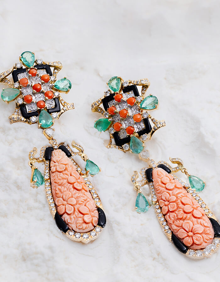 Our winsome pair of earrings in carved coral, impeccable zambian emeralds, and diamonds.