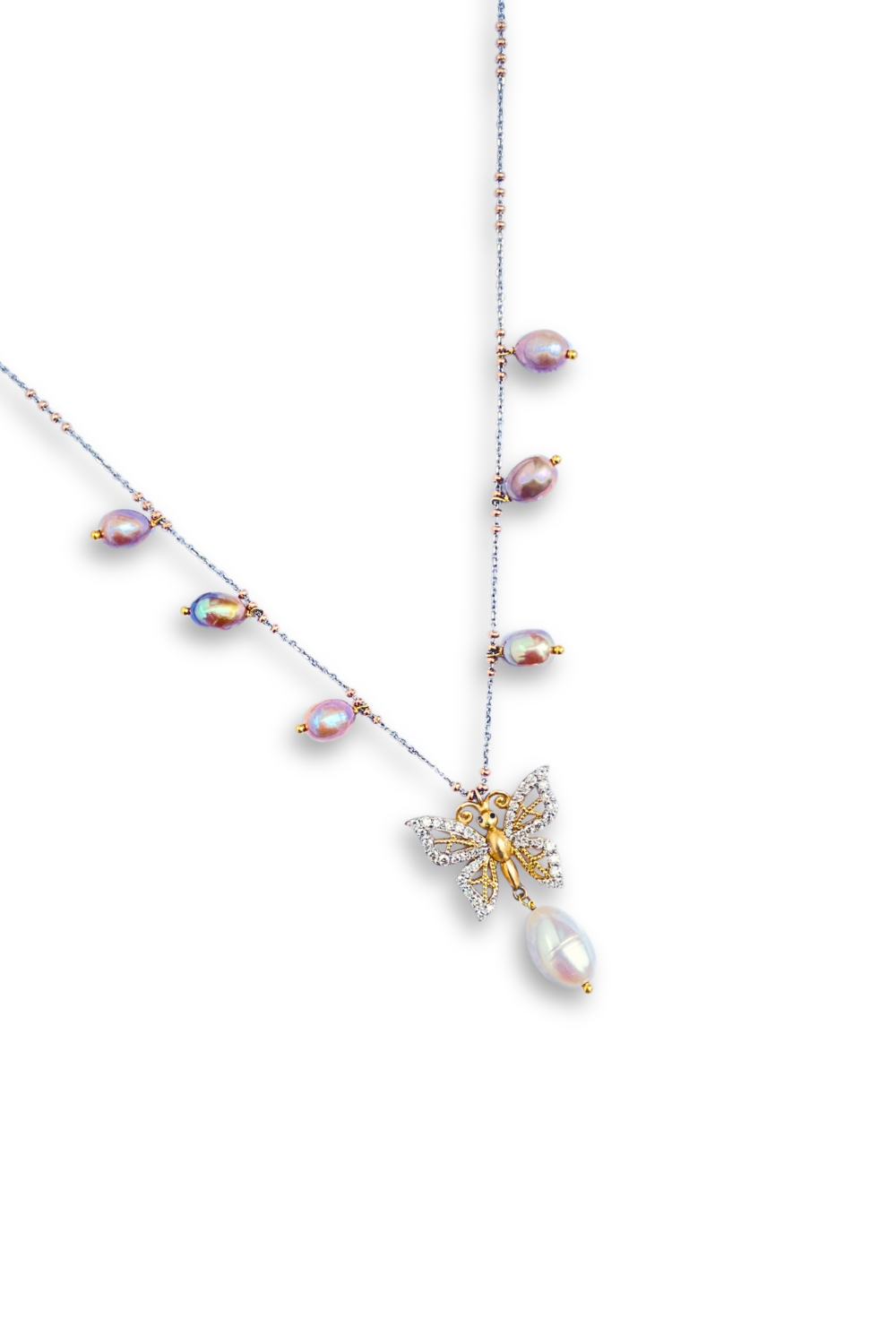 This stunning butterfly necklace blends white and yellow gold, encrusted with sparkling diamonds and accented by lustrous pearls. The intricate design exudes timeless elegance and luxury, making it a true statement piece.