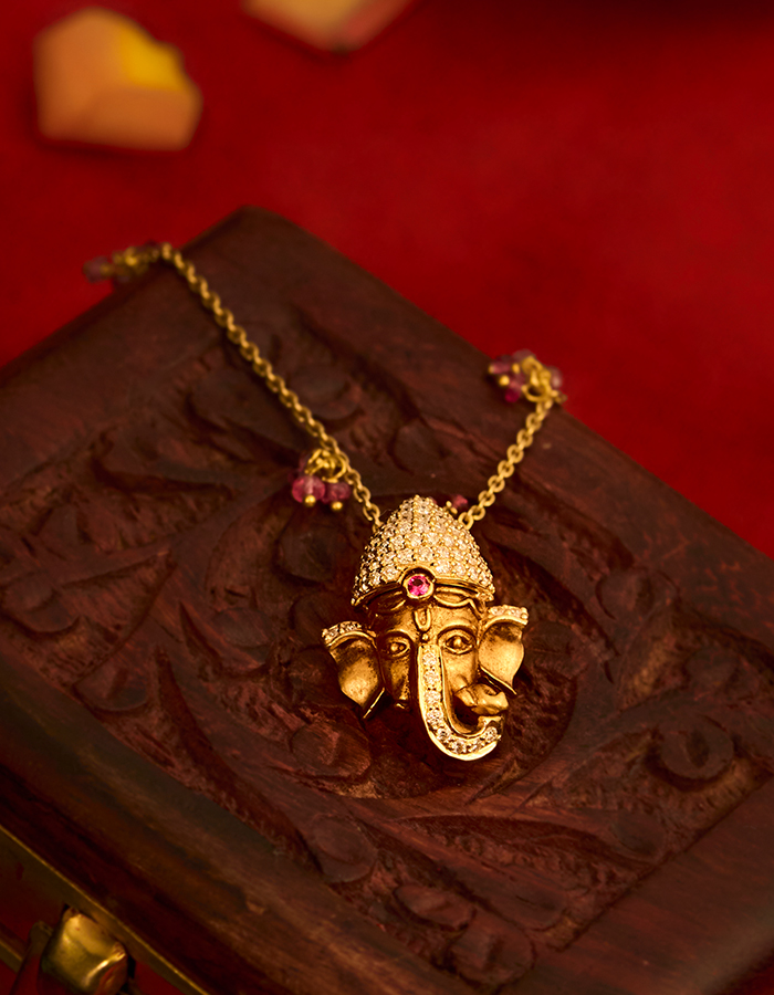 The divine lord of prosperity and success, the remover of obstacles Wear a finely crafted Lord Ganesha pendant in 22kt gold studded with diamonds, paired with a gold chain with ruby drops.
