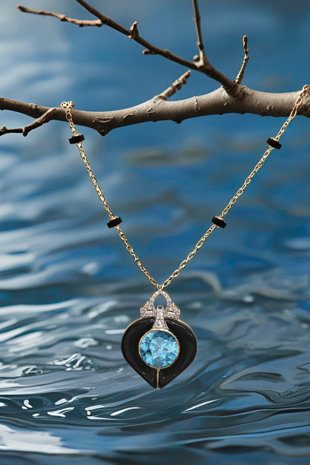 A brilliant blue topaz sparkles at the heart of a gold pendant, set against a pear drop of deep black onyx. Suspended on a traditional black-bead chain, it blends timeless symbolism with a vivid pop of color — a piece that feels both sacred and strikingly contemporary.