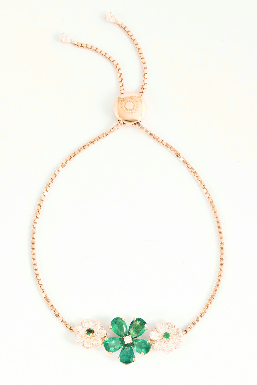 Three blooms, three energies. The central emerald petals flower radiates heart and balance, while the flanking white blooms bring softness and light. Held by a delicate chain and finished with a graceful drop, this bracelet moves with ease. A quiet companion designed to rest on your wrist, not go unnoticed.