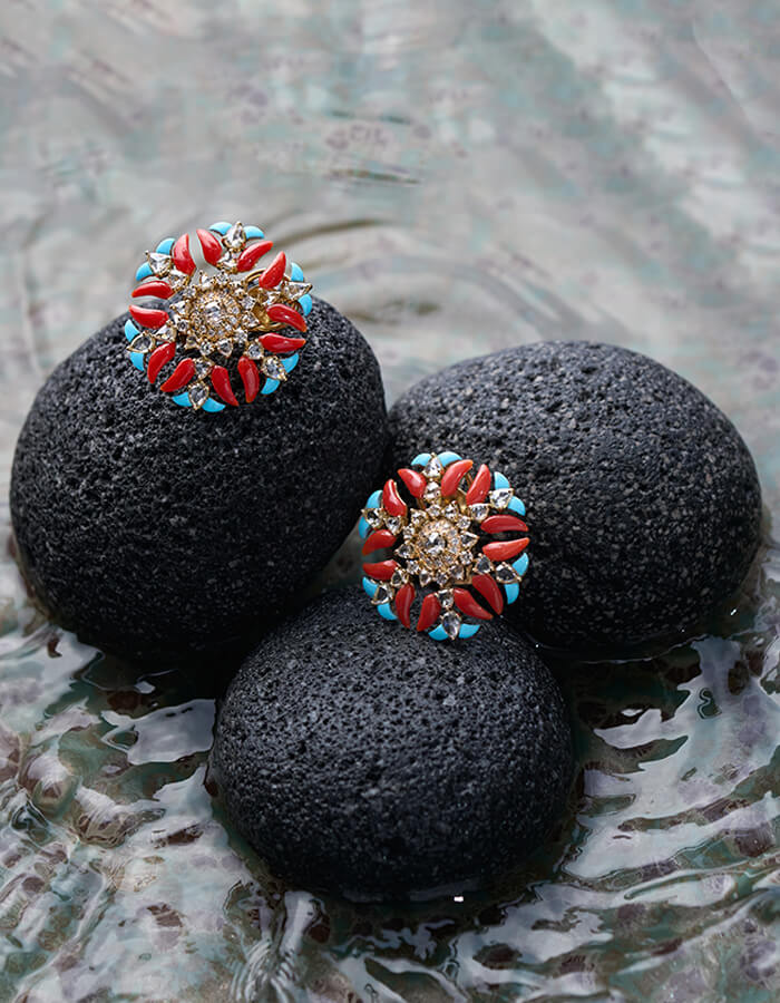 The unique combination of gemstones i.e., the coral and turquoise beautifully placed and studded with high quality rosecuts, a perfect example of design and artistry.