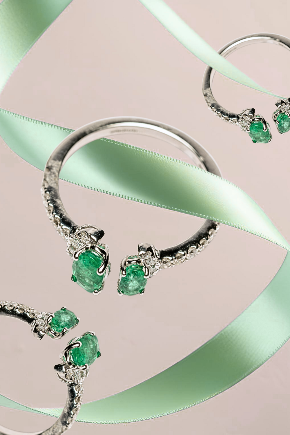 A celebration of nature’s elegance, this minimal ring showcases a vivid emerald embraced by a sparkling white diamond. Set in 18-karat gold, its clean lines highlight the gemstones’ natural beauty, offering a timeless piece that transitions effortlessly from everyday grace to special occasions.